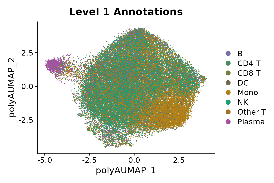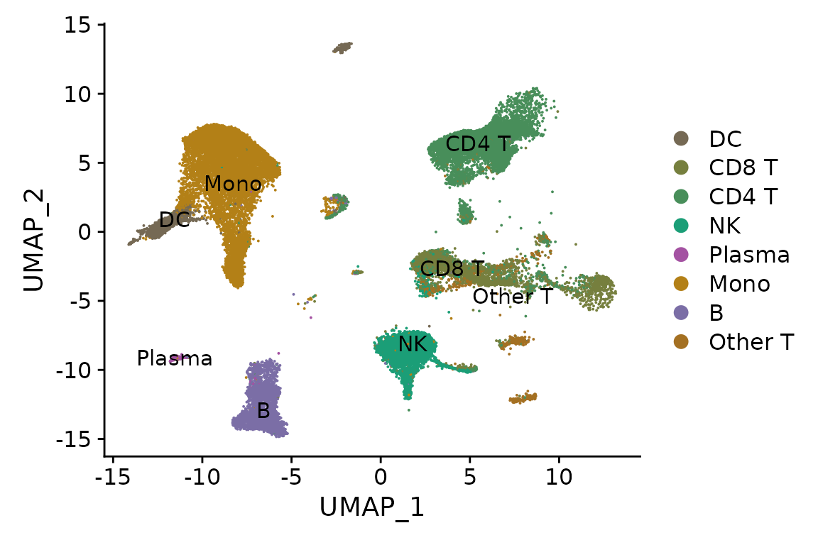 names(cols.l1) <- c("NK", "CD4 T", "CD8 T", "Other T", "B", "Plasma", "Mono", "DC", "Other")